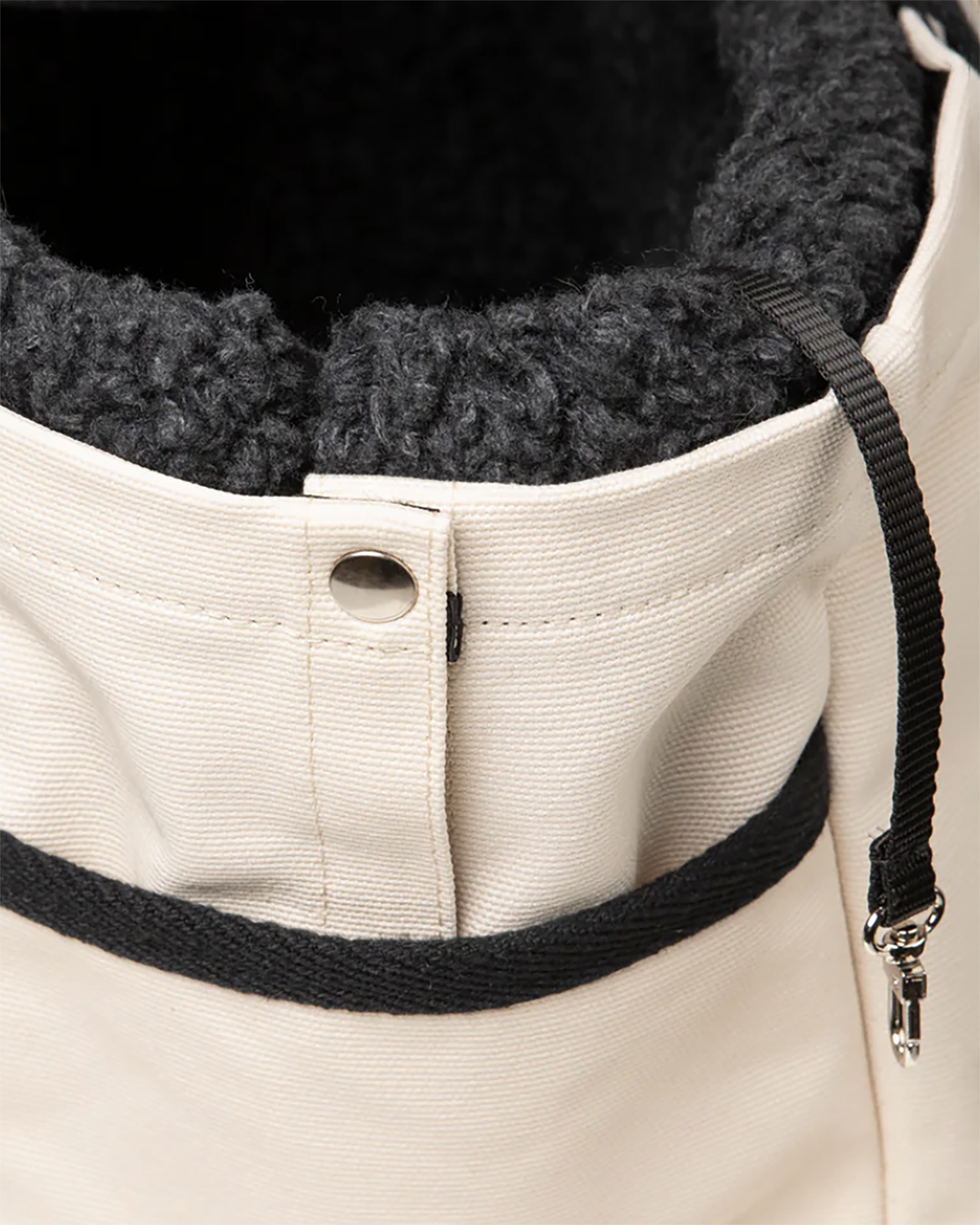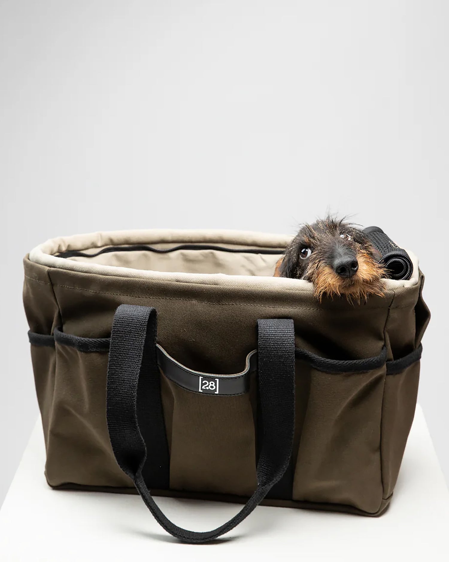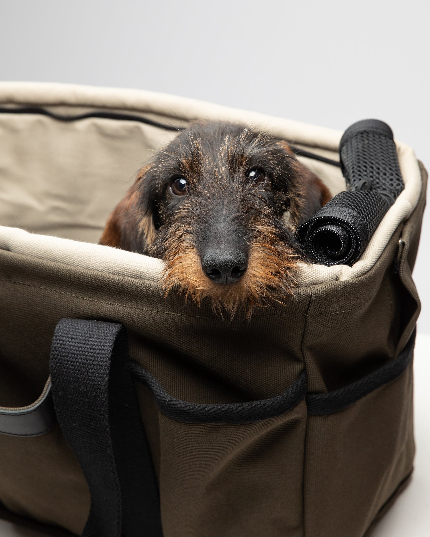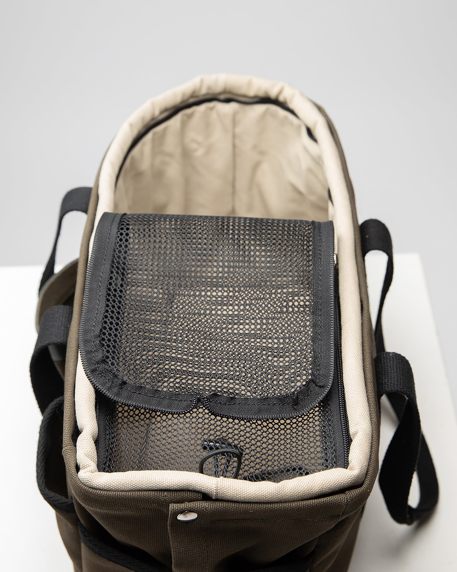 החלק החיצוני עשוי כותנה מטופלת עבה במיוחד (Treated Stain Resistance) בעלת עמידות לכתמים. התיק עתיר כיסים ותאים נסתרים, ושואב השראה מתיקי גננים פונקציונליים ועמידים. הוא רב־שימושי – מתאים לנשיאת כלב עד 8 ק"ג, וגם כתיק עבודה או פנאי.