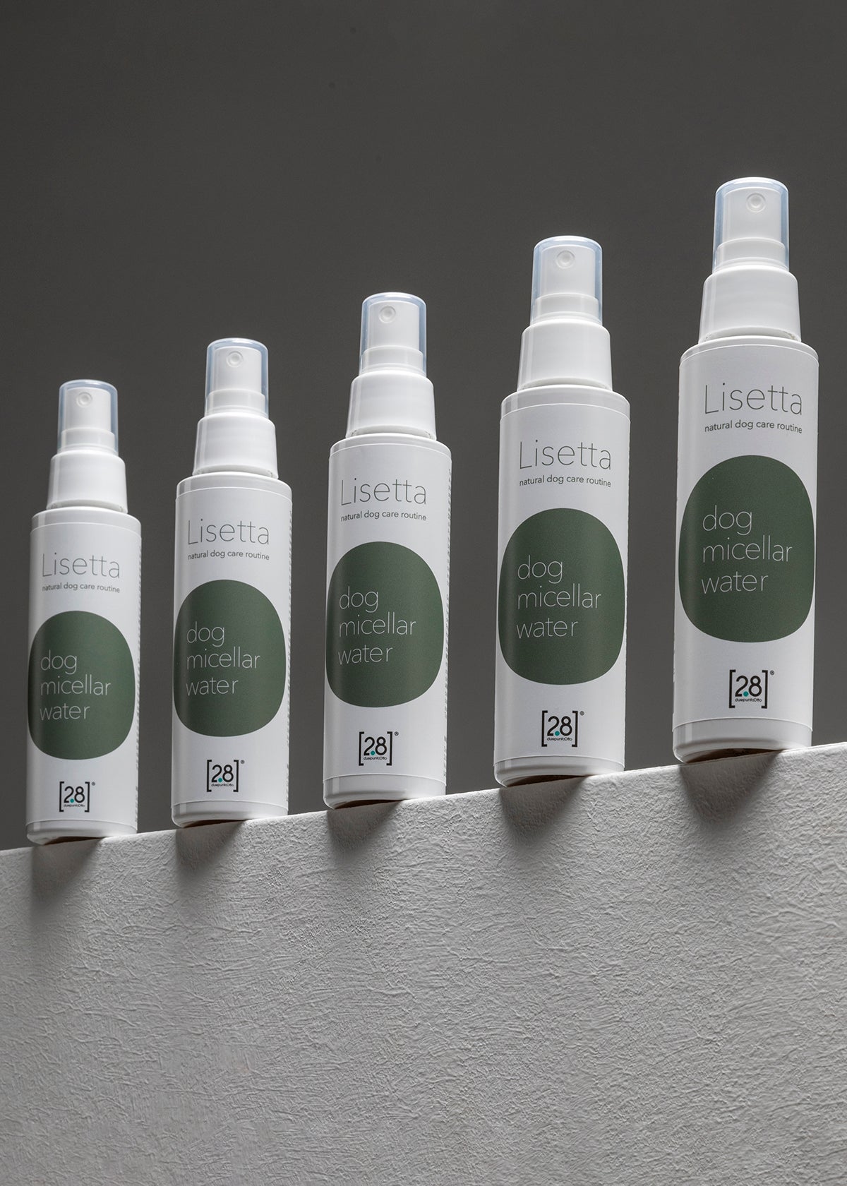 מים מיסלריים לכלבים לניקוי וריענון פרוות הכלב, מקוקלציית תכשירי הטיפוח לכלבים מחומרים טבעיים Lisetta מבית המותג 2.8 Design For Dogs האיטלקי.