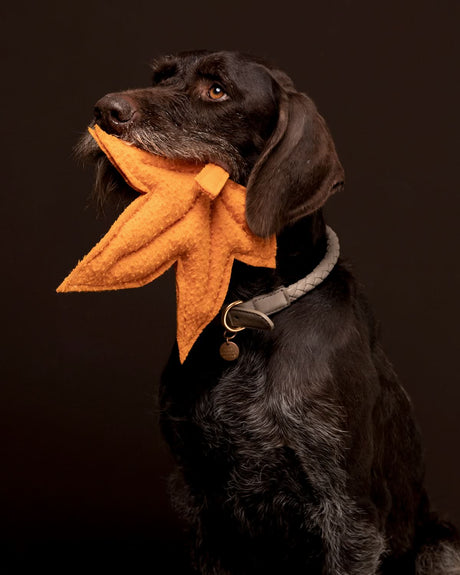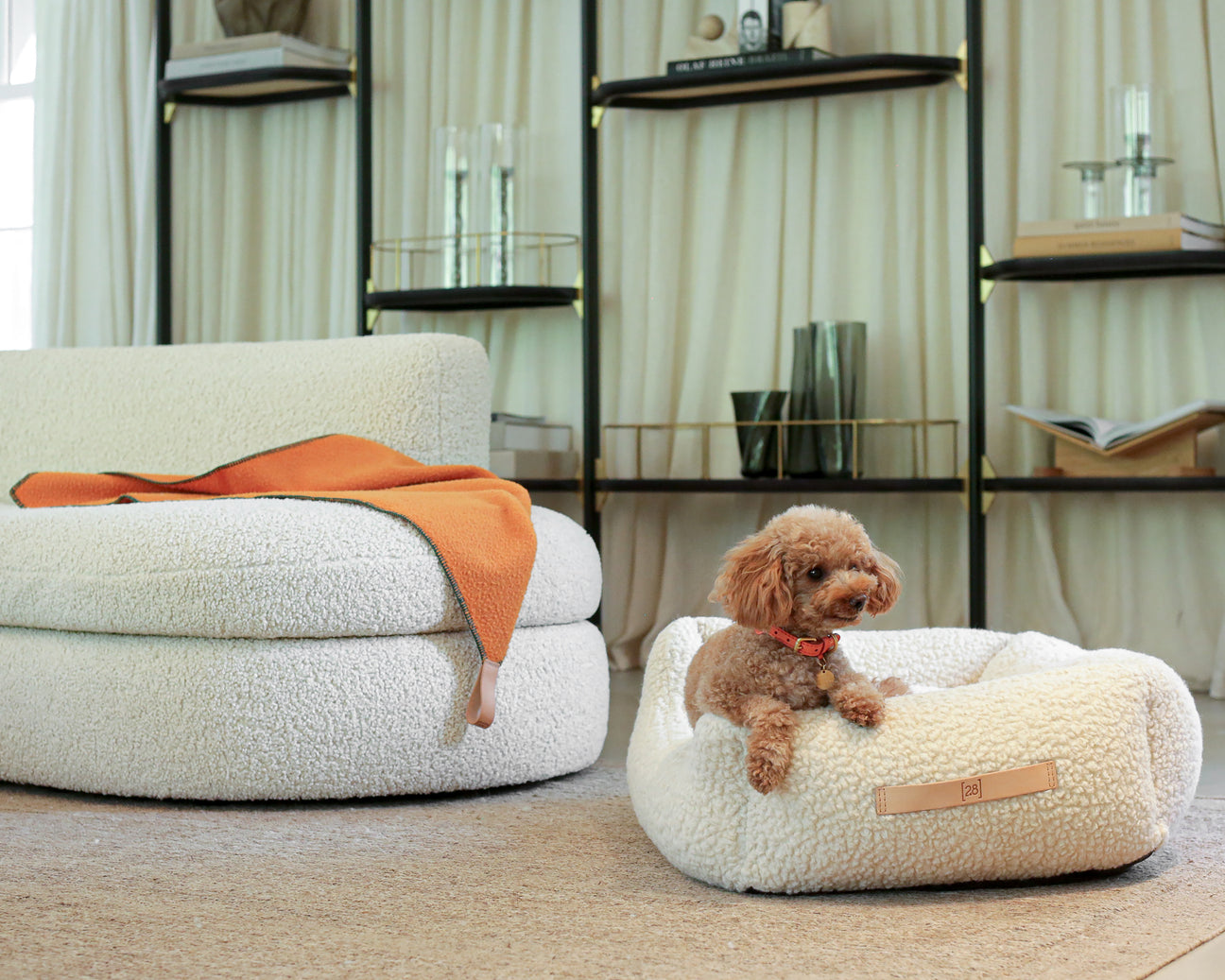 בתמונה: ג׳ני המקסימה שוכבת על מיטת Henri עם ריפוד צמר בוקלה איטלקי רך ומפנק, עונדת קולר Mario מעור נאפה בגוון כתום שמכניס נגיעה חמה ומדויקת.