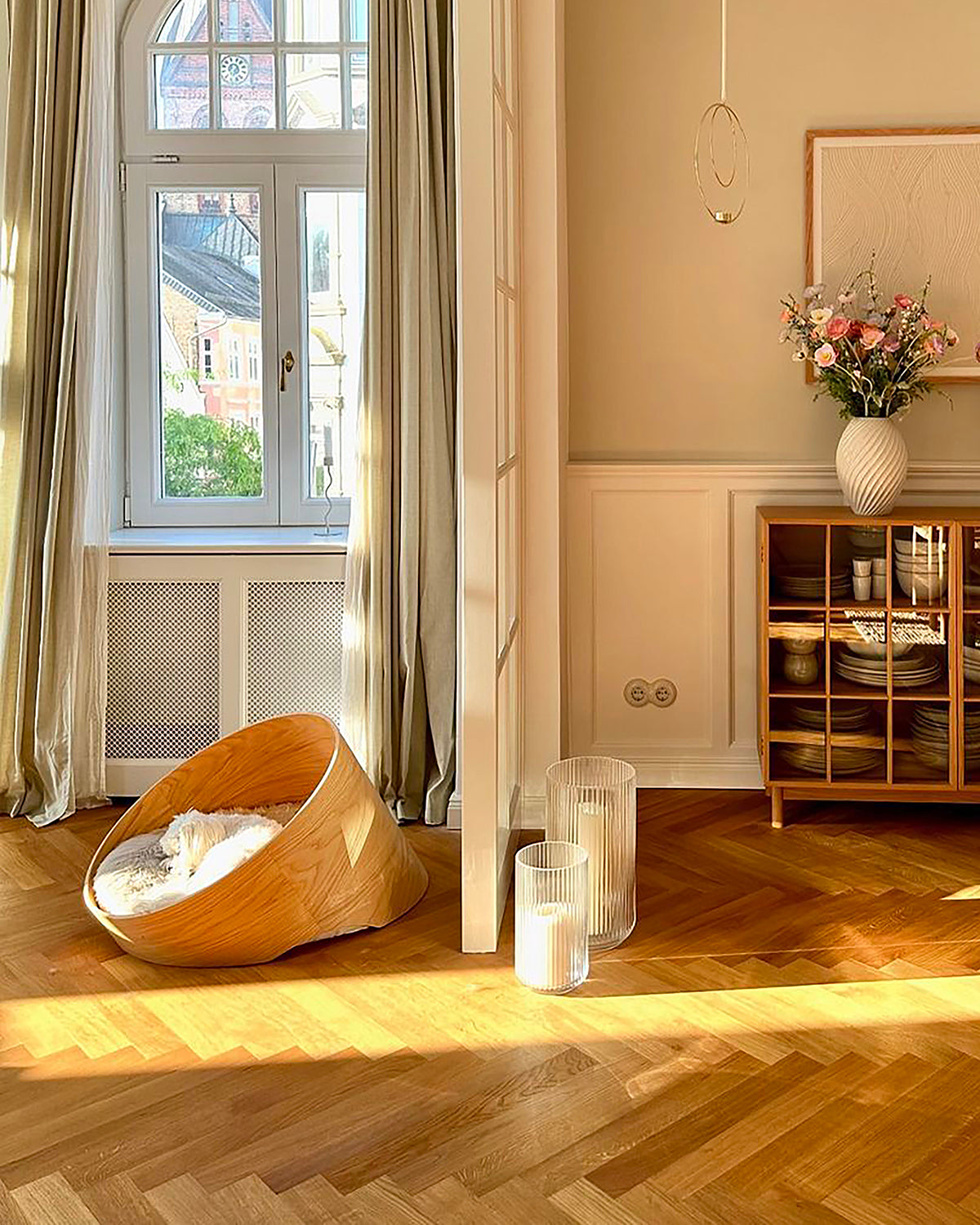 שלבו את מיטת העץ עם מעמד הקערות לחתולים מעץ תואם Desco לעיצוב הרמוני, חמים ומודרני שמשתלב בסלון, במטבח ובחדר השינה.