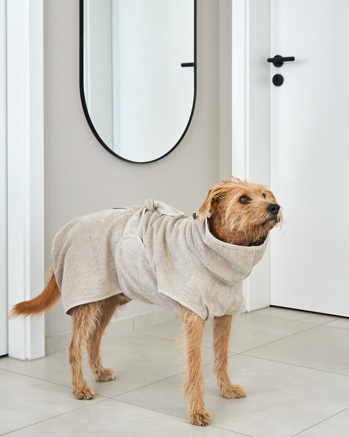 חלוק רחצה/מגבת לכלב Bagno מעוצב בגזרה שמתאימה את עצמה לכל כלב ונסגרת בצורה קלה ונוחה. הוא עשוי כותנה אורגנית שמייבשת את הפרווה בצורה היסודית ביותר.