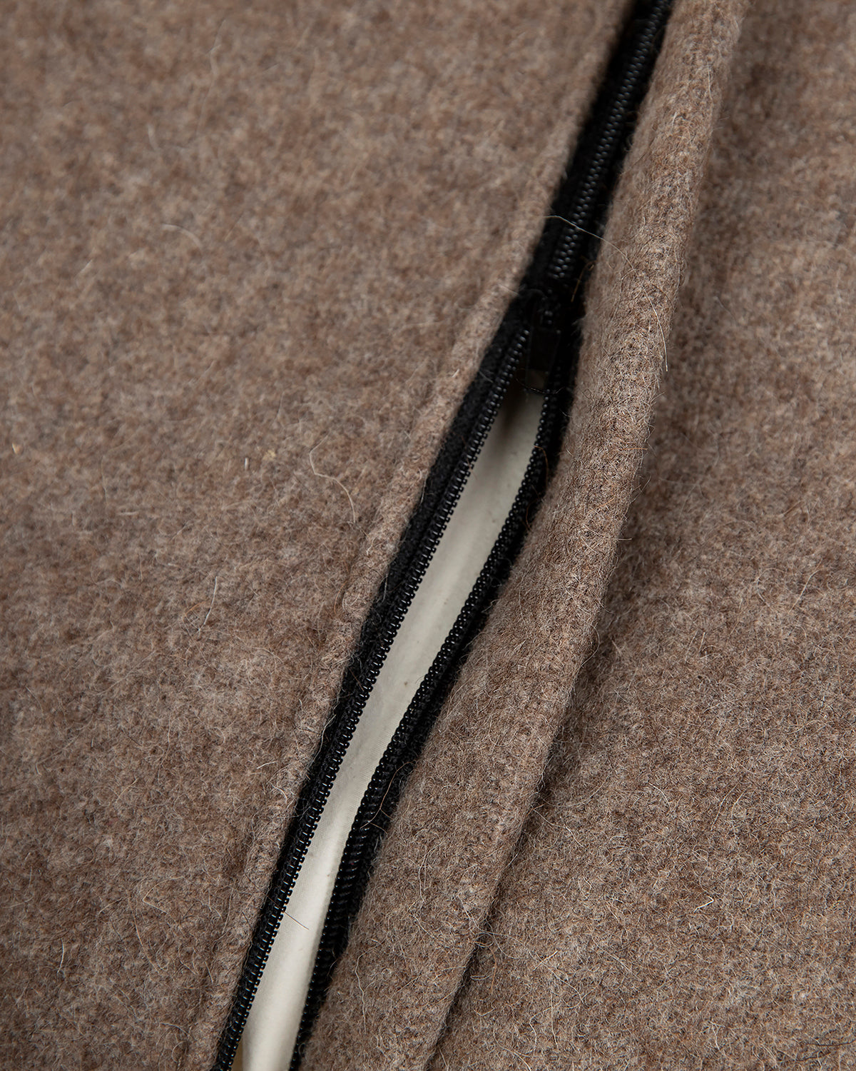 הריפוד הוא בגוון חם של צמר טבעי, עם קווים לבנים, מוסיפים עומק ותחכום, בתוספת ידית אחיזה מעור טבעוני איכותי - לשדרוג המראה ולנוחות מקסימלית. הידית ניתנת גם היא לשטיפה (ראו 'הוראות שימוש ושימור׳).