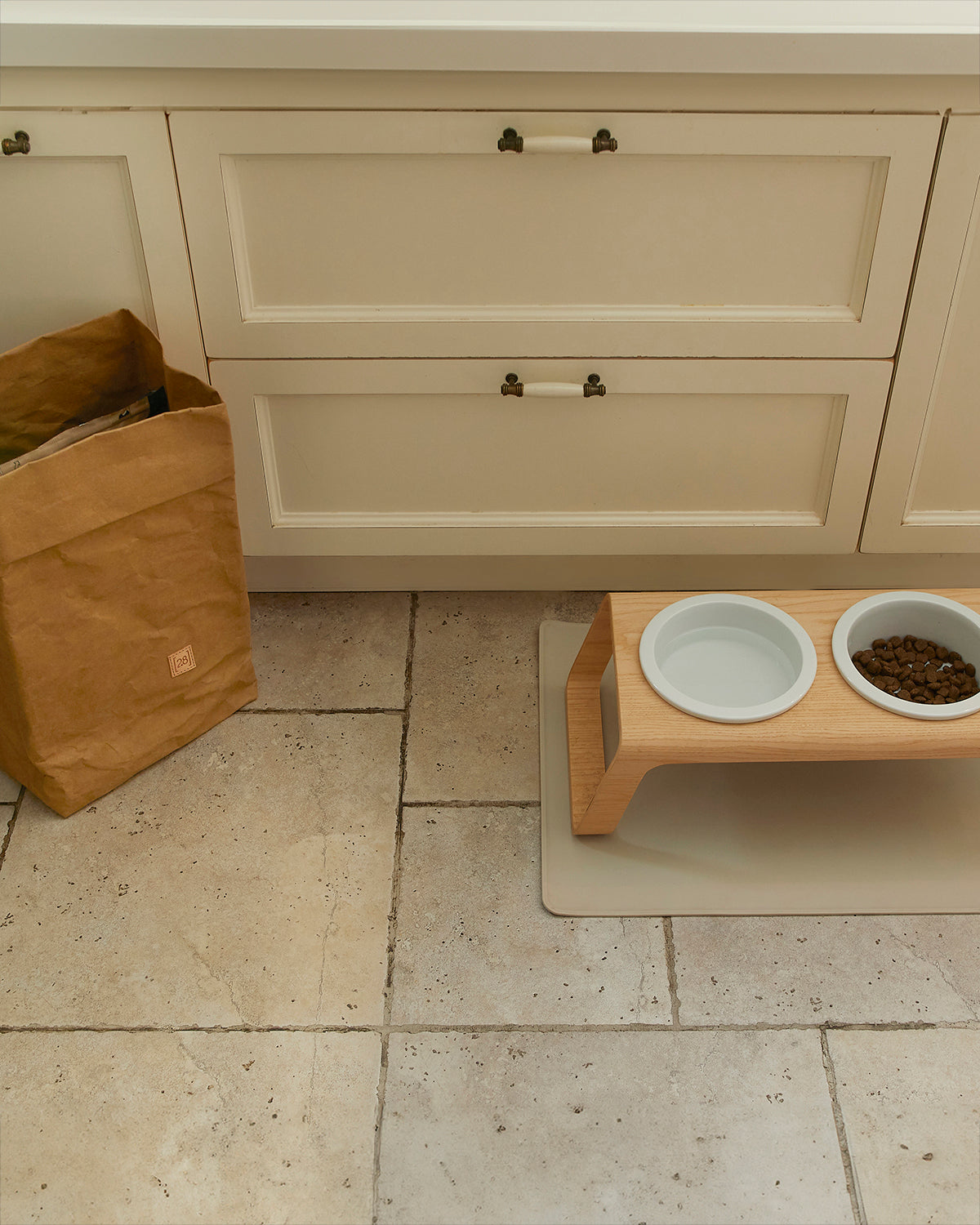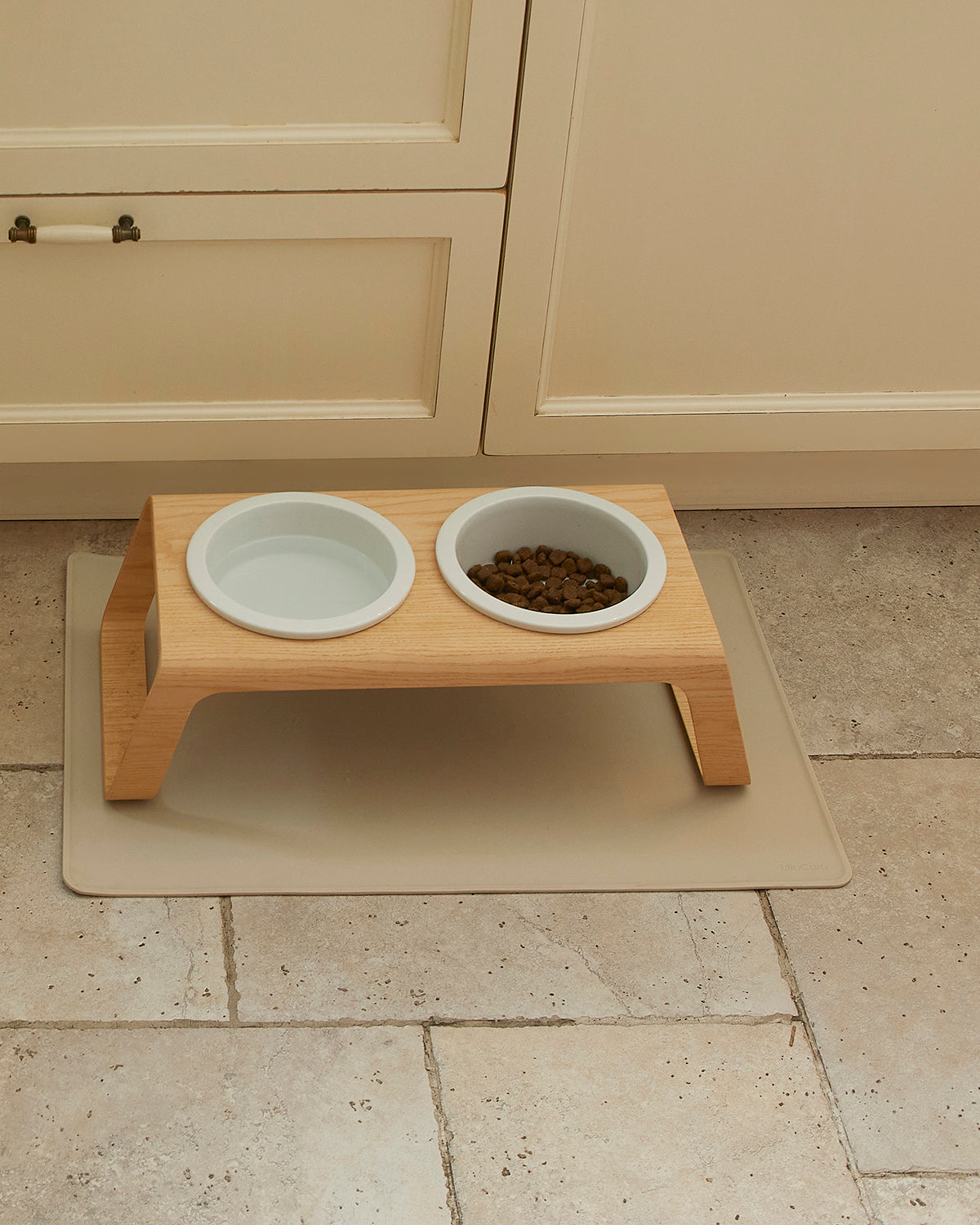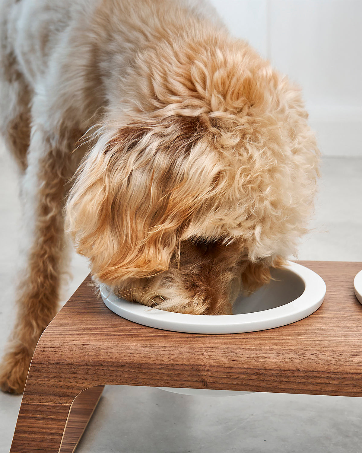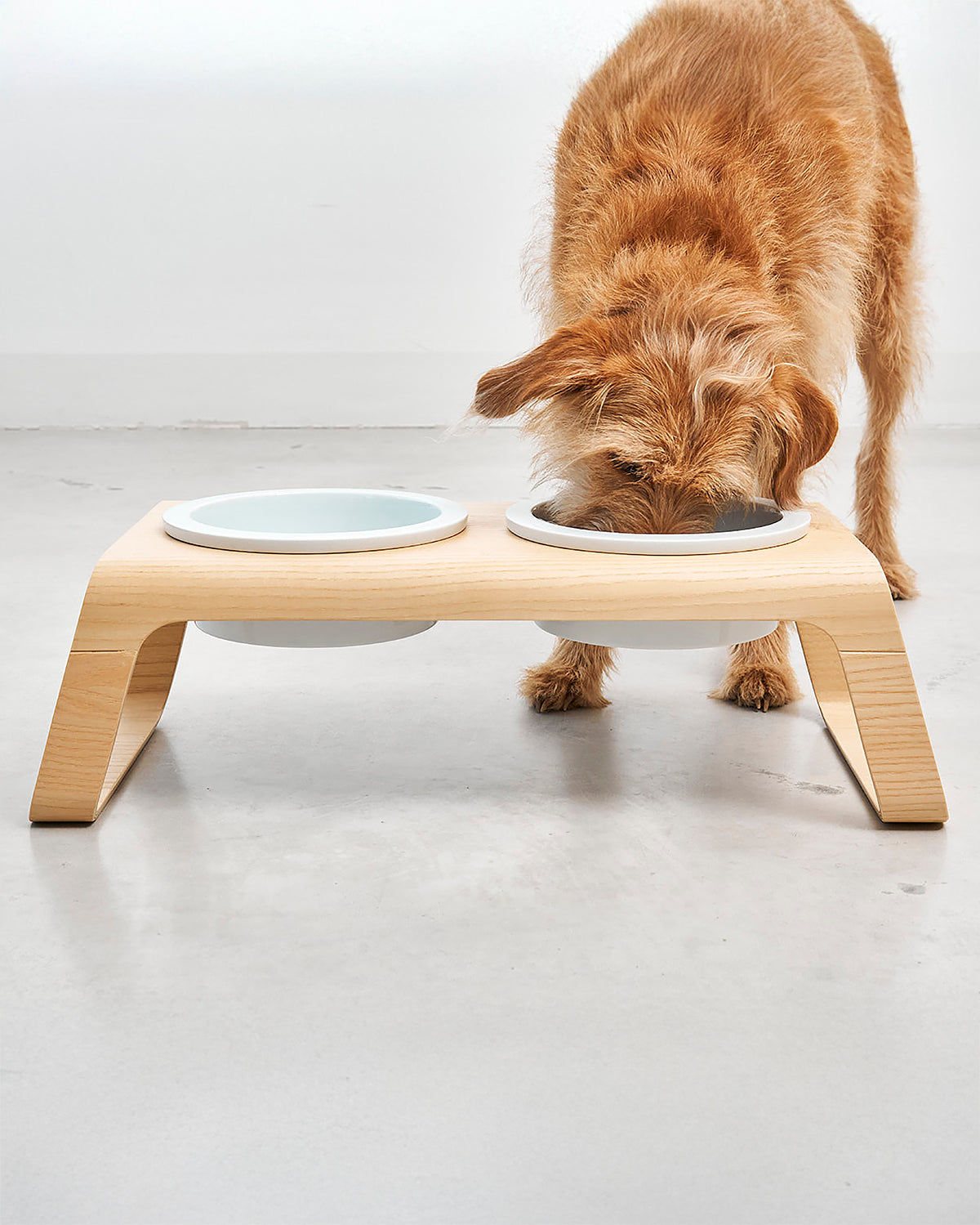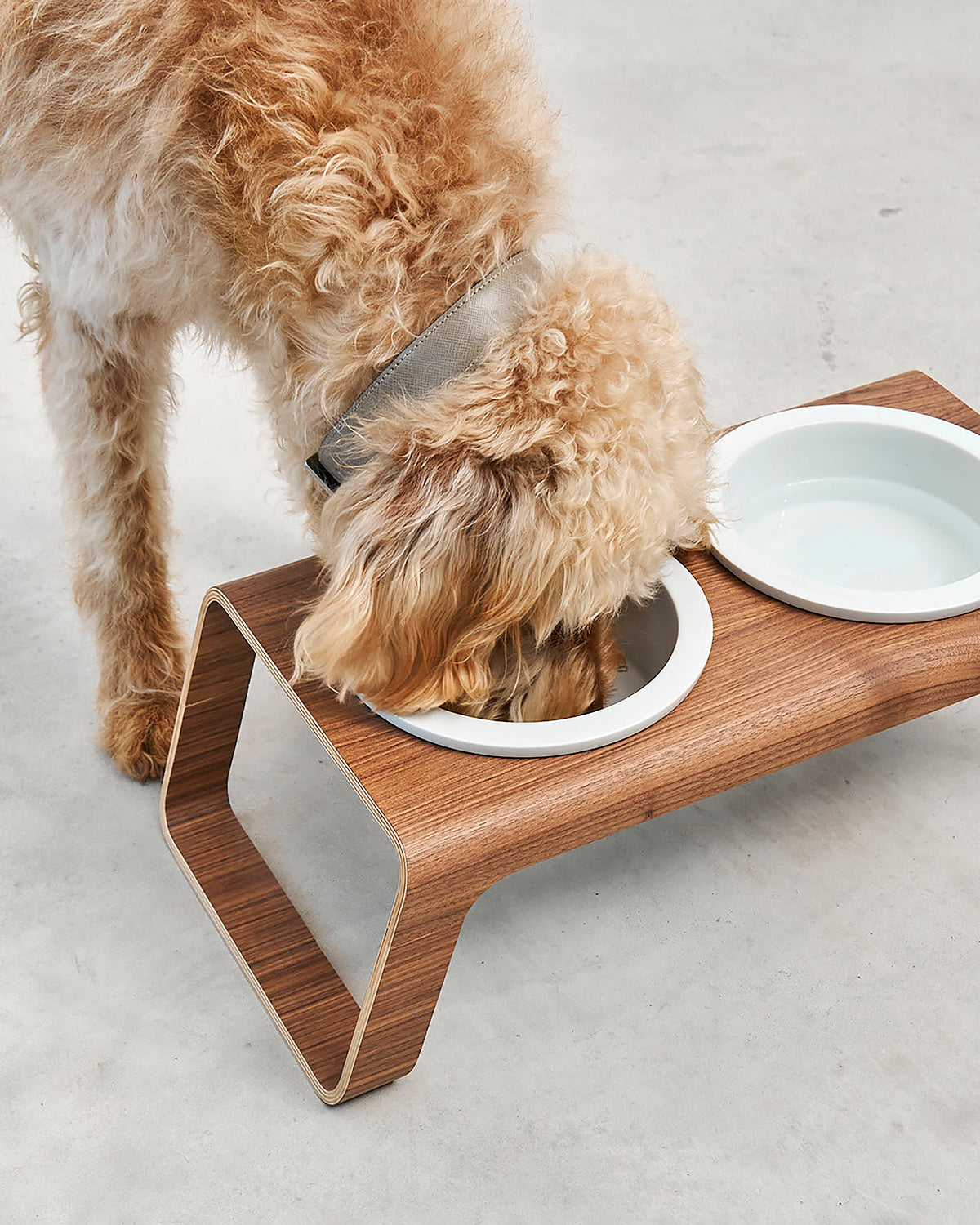 המעמד עשוי בקפידה מעץ אגוזי מלך או מעץ מילה לבחירה, ומשלב זוג קערות פורצלן בעבודת יד מתוצרת גרמניה – כך שהוא מספק בקוד אחד את כל מה שצריך לפינת האוכל של הכלב: קערת מים וקערת אוכל במעמד יחיד.