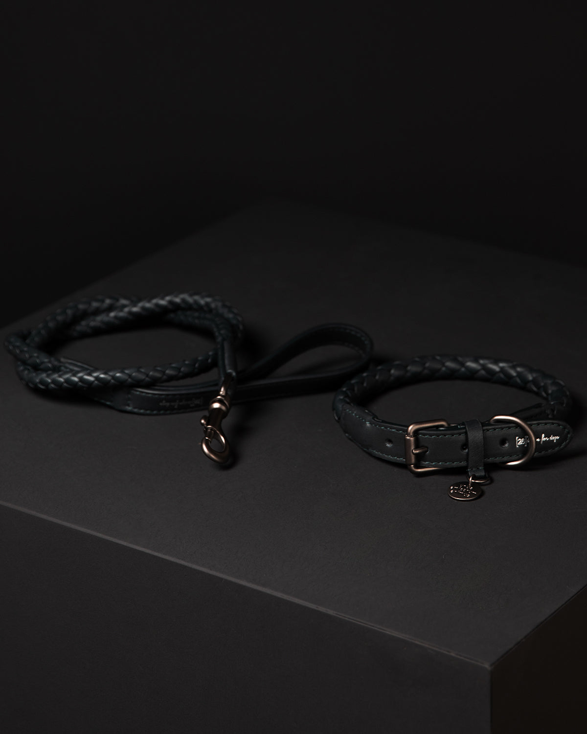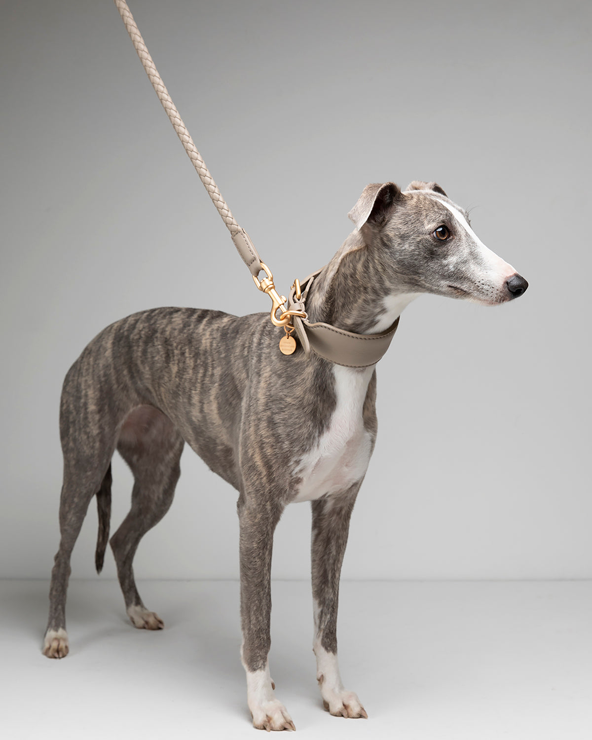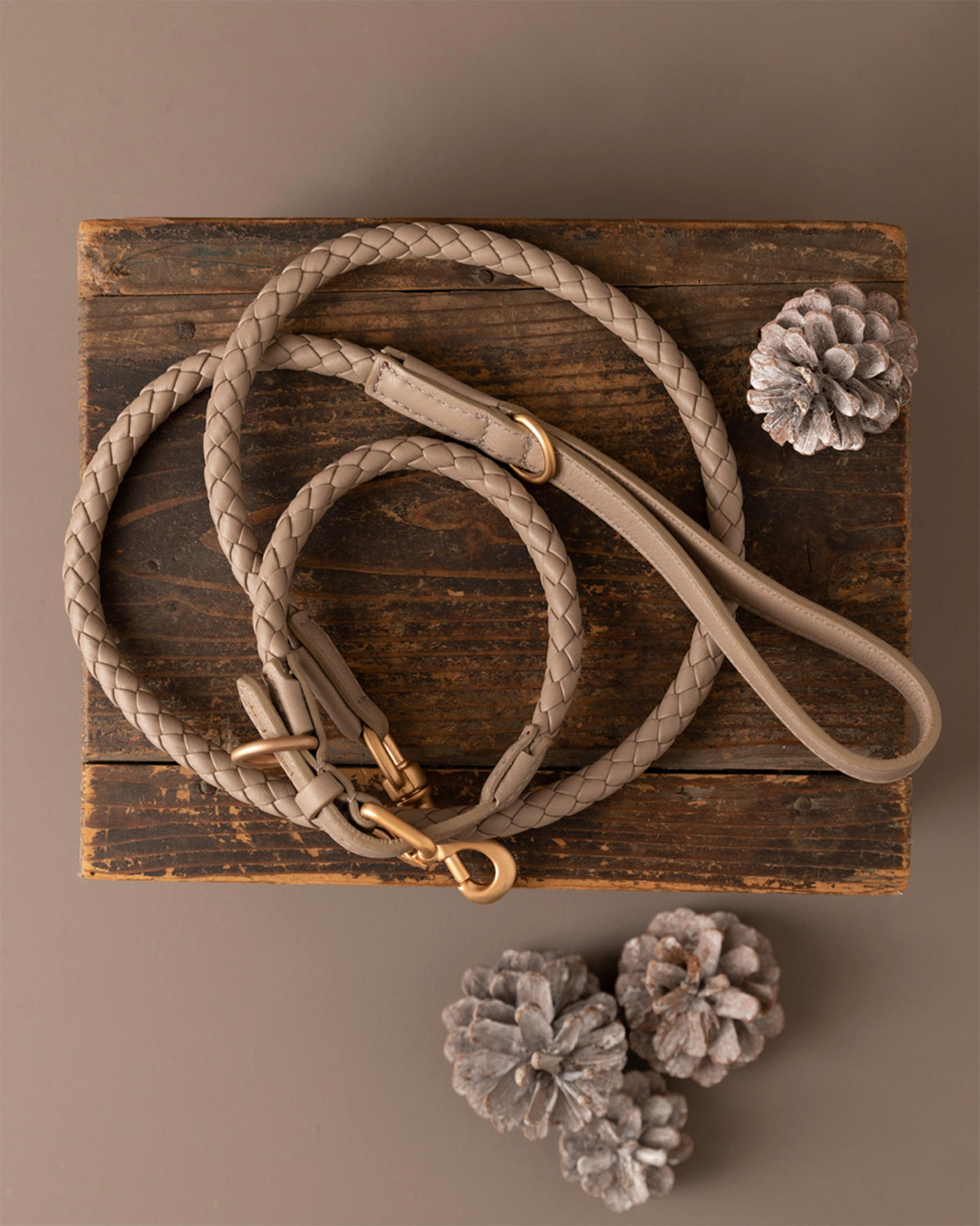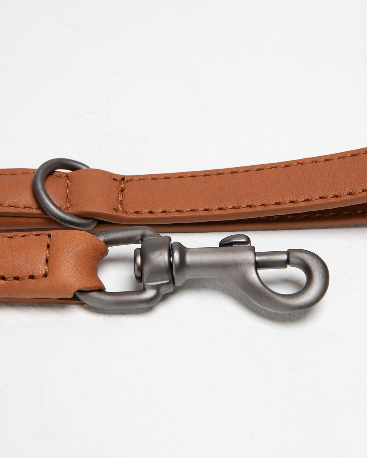 הרצועות עשויות עור נאפה קלוע יוקרתי, שנבחר בקפידה בזכות רכותו ומרקמו. החומר עובר תהליך שיזוף צמחי קפדני לשיפור העמידות, והתוצאה היא רצועה שמרגישה נעימה גם למגע היד וגם על צוואר הכלב.