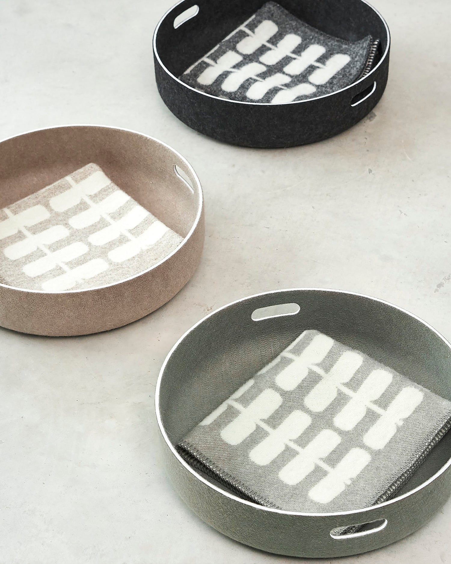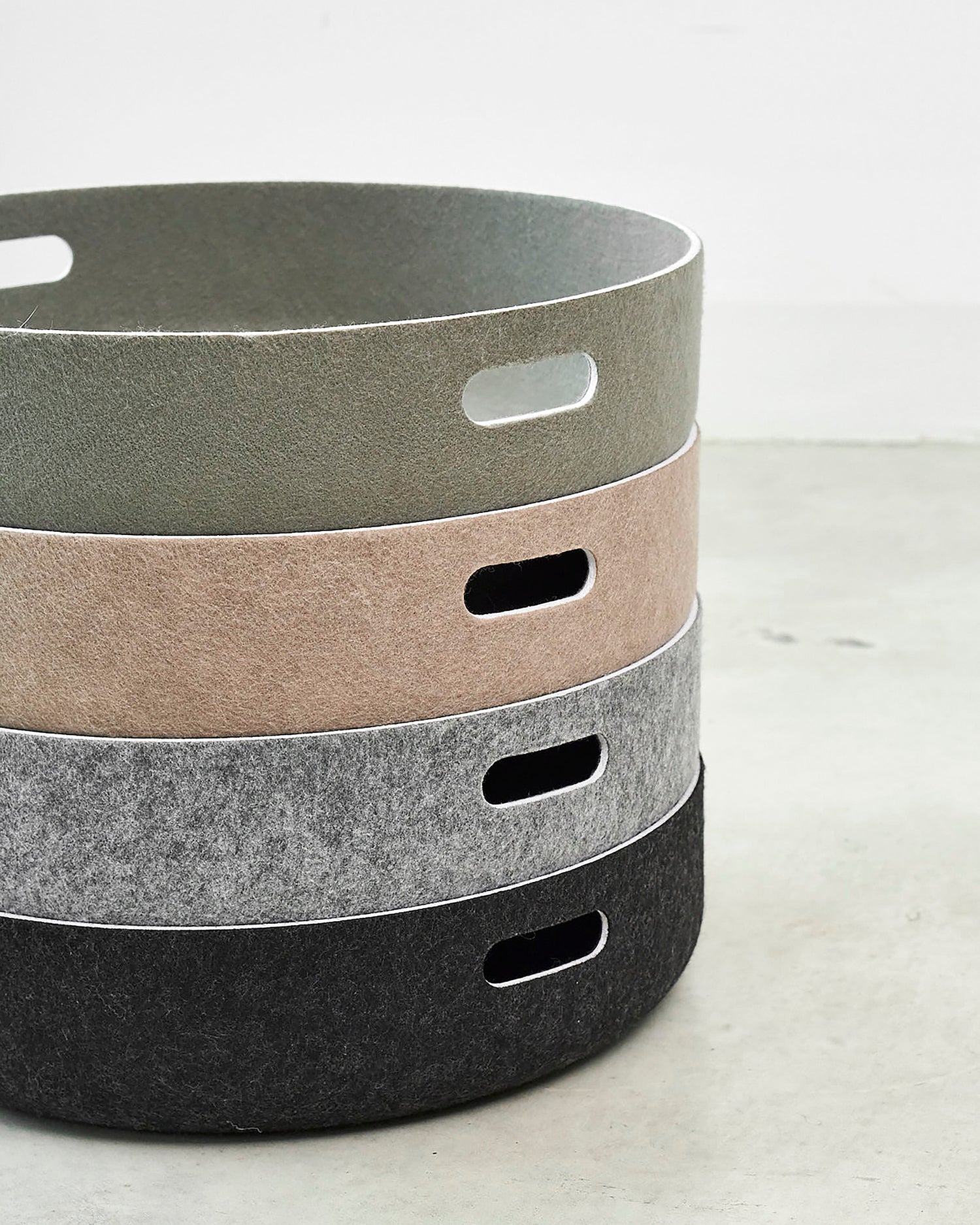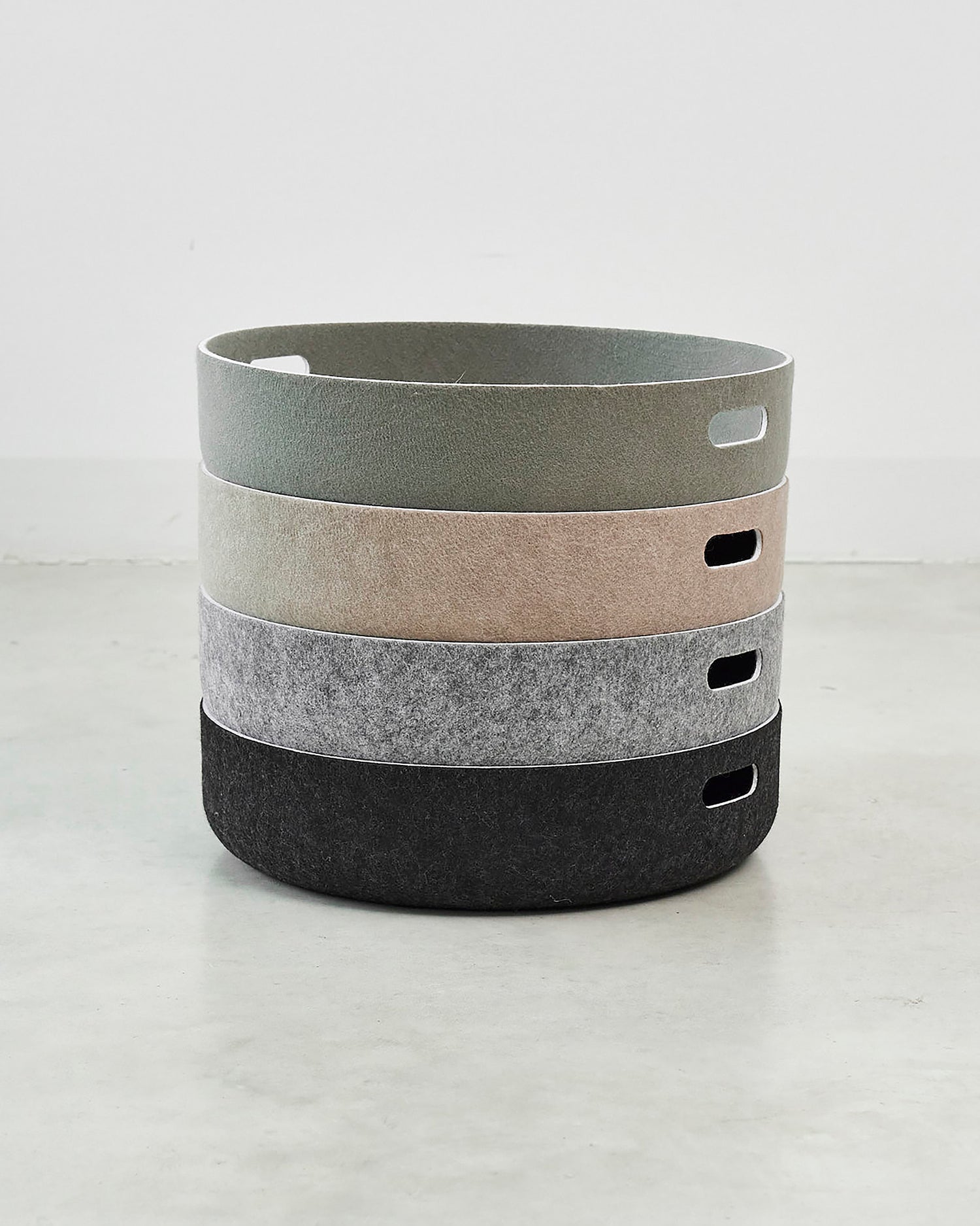 כל סלסלת Cesto מיוצרת מסיבי לבד דחוסים (formfleece), העשויים מבקבוקי PET ממוחזרים. החומר הייחודי שומר על צורתו לאורך זמן, יציב ועמיד בשימוש יומיומי – אך במקביל מציע מראה ומגע רכים וטקסטורליים.